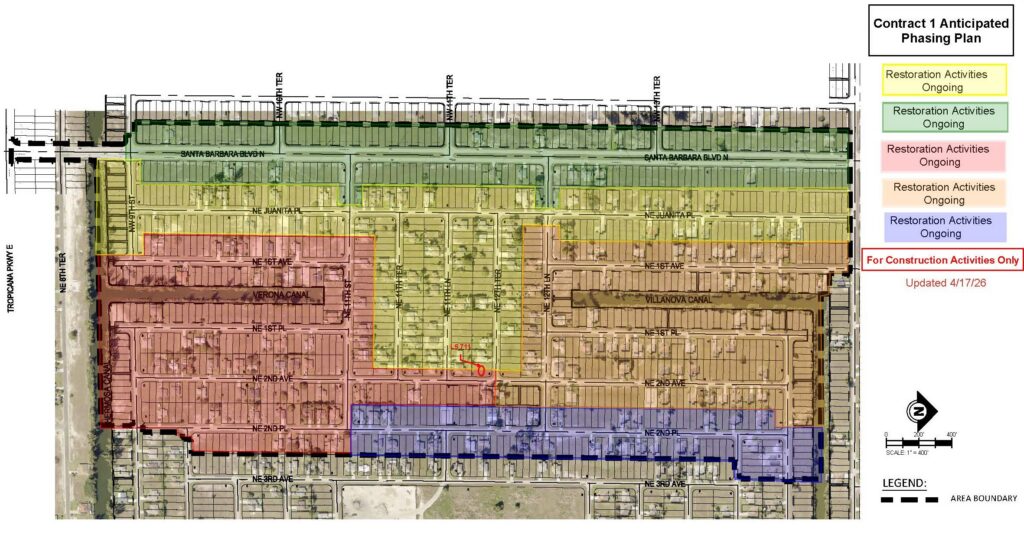 Contract 1 consist of portions of the following streets south of Diplomat Parkway East, east of Santa Barbara Boulevard N, west of NE 4th Avenue and north of NE 9th Street: