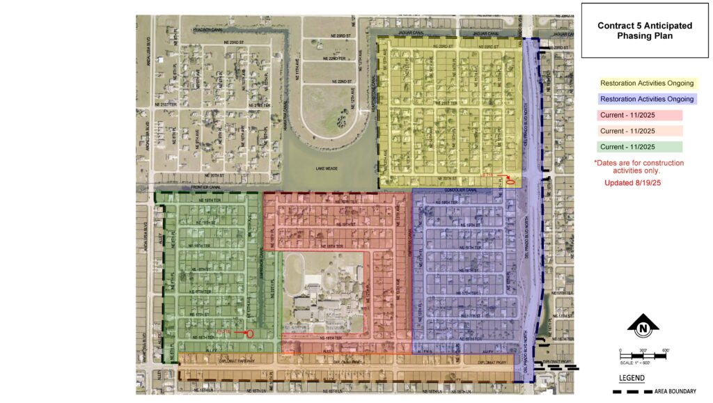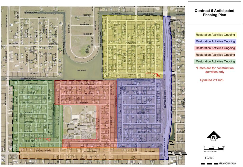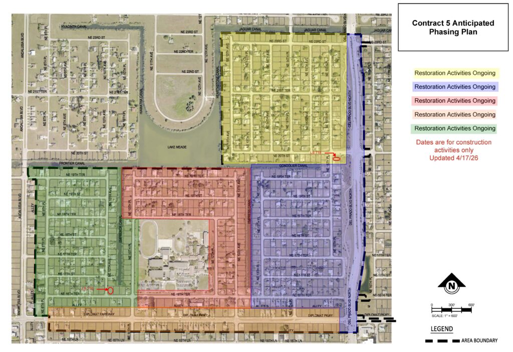 Contract 5 consist of portions of the following streets south of NE 23rd Terrace (Jaguar Canal), east of Andalusia Boulevard, west of Del Prado Boulevard north and north of NE 15th Lane):